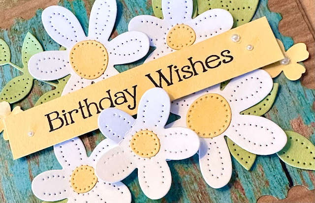 Birthday Wishes was my sentiment of choice because I NEVER have enough birthday cards! Tiny, dainty pearls were my embellishment of choice against the rough texture of the wood paper.